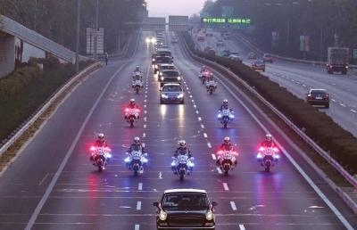 國賓護衛隊員護衛著國賓行進在機場高速路上。京華時報特約記者李光印攝