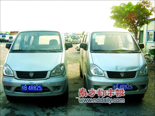 昨天下午4點(diǎn)鐘,羅湖交警大隊(duì)西嶺下扣車場,丁先生的車和套牌車停在一角。“這簡直就是孿生的嘛”,一位車場工作人員這樣說,兩輛車同為哈飛面包車,車型完全相同,顏色同為銀灰色。