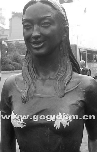 昨日,記者途經河濱公園門前的人行道上時,見到兩塊都市牛皮癬居然粘貼在銅像雕塑少女的胸部,一些市民覺得實在不雅,想撕掉卻因粘得太牢而無果。(記者 陳華飛)