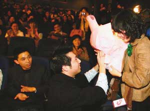 現(xiàn)場(chǎng)的朋友們見證我們的愛情,你愿意嫁給我嗎?”3分鐘短片結(jié)束,放映廳也恢復(fù)了光明。人們看到,觀眾席里有個(gè)小伙子正跪在一個(gè)女孩面前,手捧玫瑰、鉆戒,緊張地等待著女孩的答復(fù)。“我愿意,我愿意……”女孩連連點(diǎn)頭,泣不成聲。雷鳴般的掌聲里,這場(chǎng)浪漫求婚秀的主角、濟(jì)南某公司銷售經(jīng)理謝剛,一把攬過女友孫靜,陶醉在一片幸福的海洋里。