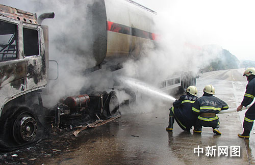 據消防官員稱,距現場1公里處,天空升起滾滾黑煙,現場油罐車火勢已經在車頭和罐體整體燃燒起來。參戰官兵立即運用消防車車載水炮,冷卻油罐車罐體。10分鐘后,消防官兵在高速公路上鋪設兩條水帶干線,利用2支水槍前后夾擊進攻油罐車車頭和罐體火勢, 20分鐘后,油車大火被成功撲滅。