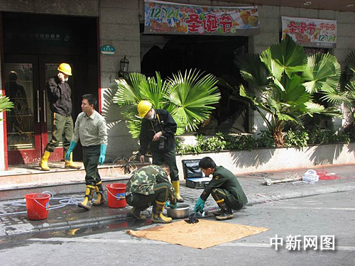 記者發現,消防人員正在餐廳里面勘查。名典西餐廳隔壁的桂鴻茶餐廳經營者方先生是第一個發現火情并報警的人。據他介紹,他于十二日傍晚五時零八分發現名典西餐廳二樓冒煙起火,二分鐘后他撥打報警電話,十幾分鐘后消防人員趕到現場,消防人員用了十五分鐘將大火撲滅。據方先生介紹,火災發生時有二男一女用凳子砸破玻璃窗從二樓跳下,一男子摔在路邊小車上,腿部與腰部受傷,目前已經脫離危險,另有一男子還在樟木頭人民醫院重癥監護室,未脫離危險。