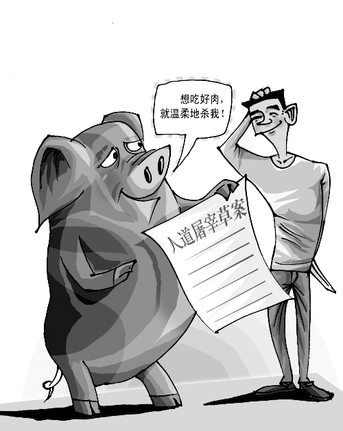 趕豬的時候,要拿著塑料拍輕輕地拍豬屁股,哄著它往前走;在上“斷頭臺”的途中,還要看到自己的伙伴,這樣才能讓待宰的豬沒有恐懼感……這些僅僅是正在制定的人道屠宰規定的一小部分。