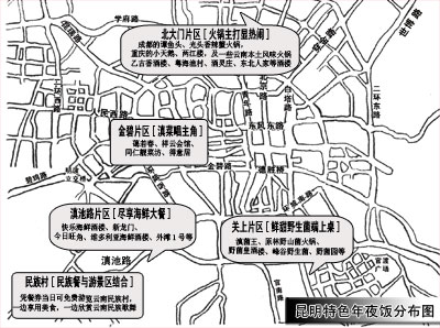 北大門區域的品牌火鍋最為集中,成都的譚魚頭、光頭香辣蟹火鍋,重慶的小天鵝、兩江樓檔次高、口感好、環境好、服務好。此外,這個區域的酒樓風格最豐富,乙古香酒樓(滇味精品家宴)、粵海漁村(老牌平價海鮮酒樓)、酒靈莊(騰沖風味)、東北人家(東北風味)等等,不同的風味,可讓你吃不膩。10人桌收費標準視實際菜品確定,人均消費30-80元。