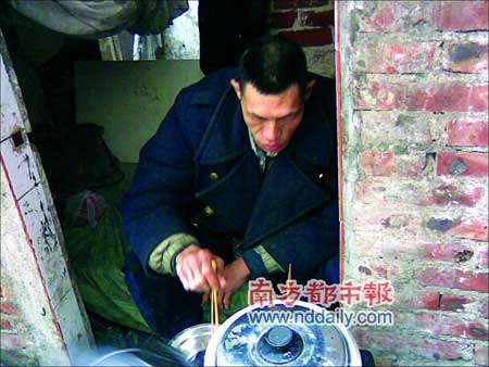 從祖屋西側門進去39號的院子,記者發現院門前有間依祖屋搭建的兩平方米的屋子,屋子里放著一張不足一米寬的床,床上擺放的被子物品骯臟不堪,一中年男子坐在床沿,目光呆滯,伸腿就是屋外。記者試著和他交流,但旁人稱他一般不和陌生人交談。附近街坊告訴記者,他就是梁志雄,有智障。