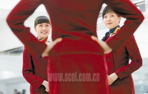 挺胸、抬頭、收腹、頭頂書,保持身體平衡,不讓書掉下來,一站就是幾個小時。這就是空姐在飛乘中保持良好體態的秘訣。“好苦哦,一站就是半天,兩腿僵硬得路都不會走了。前幾天的訓練中還有三名同學暈倒了。”學員蔣瀟瀟說。那天下午的形體課,向往常一樣同學們在教室里,頭頂著書練習站姿,突然聽到“砰”的一聲,一個同學就倒在了地上,接著另一個同學也倒下了,大家還沒反應過來,又一個同學倒在了地上。“訓練強度太大了,簡直跟特種兵的訓練差不多。”課間不放松,課外也練。每天早上7點鐘輪流派四名學員站在大門口,迎接前來上課的每位同學,“早上好、早上好……”這樣的練習每天都在進行。