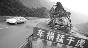 彭水縣交警大隊(duì)副隊(duì)長(zhǎng)蔣仁康介紹說,該地因地形原因,經(jīng)常發(fā)生事故,以前每年都要發(fā)生幾起車輛墜崖事故,后來他們將一車禍殘骸拉到這里來,搭建了殘骸展臺(tái)!笆鹿拭黠@減少了!”蔣介紹,“以前這里曾發(fā)生過車輛墜崖6人死亡的事情,其實(shí)很多車禍都是司機(jī)違規(guī)操作!