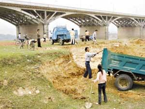 下午3時左右,兩輛微型卡車就在大橋南岸的橋墩旁進行挖砂,不到二十分鐘就裝了滿滿兩車開走了。據悉,今年以來河砂價格飛漲,“出廠價”從原來的每立方米十幾元漲到了現在的68元,只要挖一拖拉機的砂就能賺兩三百元。