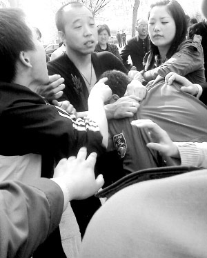 13日15時25分,讀者張先生撥打本報熱線反映說,數(shù)人正圍毆執(zhí)法人員。幾分鐘后,記者趕到現(xiàn)場,兩名執(zhí)法人員躺在地上,其中劉奇嬌已經(jīng)昏迷,旁邊有嘔吐物,同事張君毅正掐著他的人中,緊急搶救。王某在旁邊高聲叫喊:“執(zhí)法人員打人了。”然而,正在圍觀的群眾張林友讓記者看了他用手機拍的照片,生氣地說:“真是惡人先告狀,是他們喝酒后打執(zhí)法人員的。”