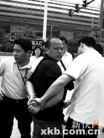 “抓住他!”眼見假證販子要逃,記者顧不得多想,兩步沖上前去抓住胖男,胖男拼命掙扎,由于他的身材比記者高大,他幾乎將記者摔倒在地。“快來抓住他!”記者一邊雙手用力鉗住對方一邊大喊。“別動!”兩名便衣警察沖了上來,把胖男按倒在地,隨即將其制服。(王華平 王炳暉 陳彬)