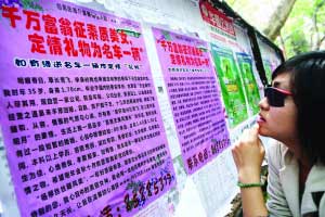 宿舍樓旁的路上,還有一些人在向來往的女生發放“征婚啟事”廣告單。多數女生坦然接受,毫不羞澀,也有一些女生捂住嘴巴,有些難為情。記者詢問一位女生對這類征婚是否感興趣,她大方地說:“我正在讀研,也是適婚年齡,他的條件的確很誘人啊,把號碼先記著,沒準也能見見面呢。”