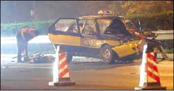 工人們正在封閉區(qū)域內作業(yè)時,慘劇突然發(fā)生。一名工人說,突然,一輛出租車穿越他們設置的路障,重重地撞到小貨車上。
