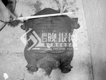 這只大甲魚是幾天前被人從尖峰嶺天池湖上釣起的,重達40斤。記者看到,這只甲魚背殼很薄,摸上去比較光滑,白色的肚皮上有花斑,顏色略白。經(jīng)測量,甲魚身長約60厘米,寬約45厘米,鱉蓋如臉盆般大小。甲魚發(fā)出的聲音像牛吼一般。