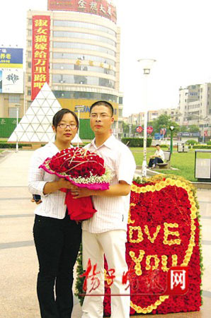 記者昨天下午趕到現場看到,“巨無霸”條幅掛在金龍大廈的東側,由于地處鬧市區,吸引了很多市民駐足圍觀。市民尹先生是“萬里路”的朋友,參與了“萬里路”特別求婚的整個“策劃”過程。他告訴記者,當天中午1時,被男友“萬里路”約到廣場的“淑女貓”,無意中看到“求愛”條幅后先是一怔,剛轉過身來,男友就像變魔術一樣捧出了大把玫瑰花,并向她單膝下跪求婚,毫無思想準備的女孩頓時激動得流下了眼淚。還沉浸在幸福當中的“淑女貓”接受記者采訪時說,她和男友是通過網絡認識的,“萬里路”“淑女貓”都是他們的網名,幾天前男友曾對她表示有件很重要的事情要和她說,當時她沒有過多在意。當天中午見到巨型條幅和999朵玫瑰花后,她感覺整個人都“蒙”了,幸福得“不知所措”、“也不知道說什么好”。