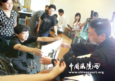 今天上午,吳華林坐著輪椅在其妻子的陪同下來(lái)到一中院聽(tīng)候宣判,法官宣布判決結(jié)果,要求全體起立時(shí),坐在輪椅上的吳華林用雙手撐住輪椅的扶手身子挺了起來(lái)。聽(tīng)到宣判結(jié)果,吳華林臉上露出了滿意的笑容。他拿出自己寫(xiě)的“愛(ài)”字和“謝謝”的條幅贈(zèng)送給法官,表達(dá)自己的感謝之情。