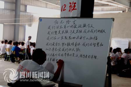盡管耳邊有不同的教學內容,但并不意味著學生就一定會三心二意。在姜久義老師的眼里,這些經歷了大地震的孩子們,非常用功,非常懂事。看到老師們千方百計聯系到這大廠房做教室,給學生們搬來1800套課桌椅、800多套上下床時,學生們明白,這個時候自己應該做什么。許多同學們都有同感:剛開始還不大適應,不過精力一旦集中,耳朵里就全是自己老師講課的聲音了。當記者接過同學們送的一支梔子花時,真實地感覺到這些學生的成熟和從容。