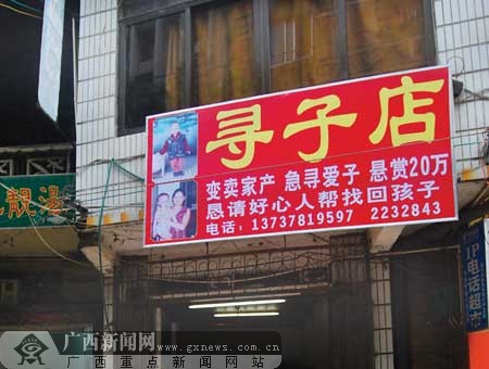 湖北人彭高峰苦苦尋子無果,在深圳開起懸賞“尋子店”。7月4日,記者在藤縣街頭也看到一個類似的“尋子店”,店主黃佩云告訴記者,她兒子莫鴻濤失蹤近5個月,警方至今沒有立案。她在網上看到彭高峰的事情后,無奈之下也效仿他在街頭開起“尋子店”,懸賞20萬元尋子。