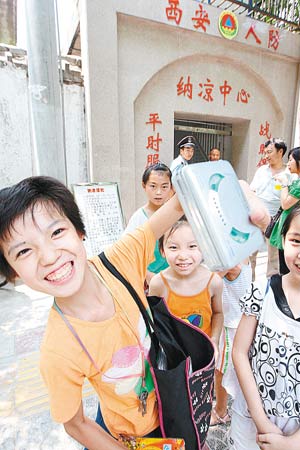 帶著隨身聽進(jìn)防空洞納涼,這名小朋友難掩興奮之情。