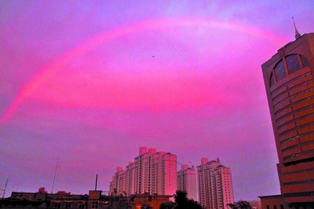 19時28分開始,彩虹的右下弧段最先形成,然后左下弧段相繼出現,最后弧頂部分連接左右兩端,形成一個完整的大彩虹,高高懸掛在新鄉市區東南方位的上空。彩虹外紅內紫,色彩鮮艷。