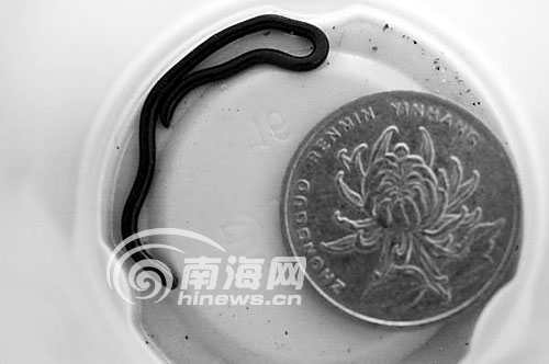 海南萬寧后安鎮何先生18日早晨9點在自家后院抓到一條只有一根牙簽大小的類似蛇的生物(右圖),何先生對照本報曾經報道過的重慶發現“世界最小的蛇”的文章后稱,他發現的生物才是真正的“世界最小”。小生物通體黑色,長約6厘米。何先生告訴記者,他小時候也曾經見到過這種生物,在海南鄉村、墻角、衛生間等潮濕的地方就會碰到這種小生物。但具體這是哪種生物,學名怎么稱呼,到底有沒有毒,何先生稱不甚了解。(南國都市報 記者李域攝影報道)
