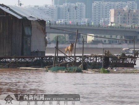 水上人家的一條狗對著洪水狂吠。伍永志攝