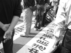 昨天早上8點,100多名浙江中港業主自發地拉著橫幅來到金華市政府門口申訴。