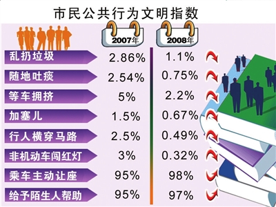 調(diào)查顯示,2008年北京奧運(yùn)會期間,北京市“市民公共行為文明指數(shù)”為82.68,比去年提高了9.3個分值。