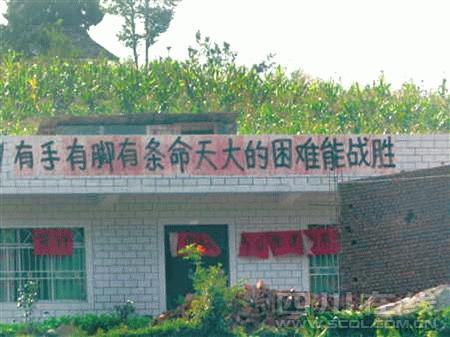 石光武是兩條標(biāo)語(yǔ)的原創(chuàng)者之一,另一位原創(chuàng)者是棗樹村村委會(huì)主任雍明。“地震后,大家碰面都會(huì)說(shuō)幾句鼓勵(lì)打氣的話,我就想選幾句寫成標(biāo)語(yǔ),鼓勵(lì)大家不等不靠,自己動(dòng)手重建家園。”石光武的話和另一句被村民經(jīng)常掛在嘴邊的話被雍明選中。7月下旬,“出自己的力,流自己的汗,自己的事情自己干”、“有手有腳有條命,天大的困難能戰(zhàn)勝”兩條標(biāo)語(yǔ)分別貼在村民尚元進(jìn)和村民李玉明家墻上。