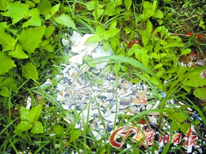 昨日,記者來(lái)到東城區(qū)溫塘村文塔路,在墓地走了一圈,發(fā)現(xiàn)這個(gè)地方大約有300多平方米,后面是一片竹林,小山頭上雜草眾生,周圍有幾棟爛尾樓,不遠(yuǎn)處有幾間小廠。即使是中午時(shí)分,也很少有人經(jīng)過(guò),因7日晚上突然下起大雨,一些未收拾干凈的骨灰聚集在一起,隨著雨水貼在草地上,與重陽(yáng)節(jié)當(dāng)?shù)卮迕窦雷鏁r(shí)留下的鞭炮碎紙片交融在一起。