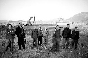 昨日下午,40余名松樹峪村村民守在村東口的修路工地里,阻止推土機掘土施工,數輛施工機器停在工地由工人看守。被推平的土地寬20余米,兩側的莊稼地里還留著連片的秸稈。
