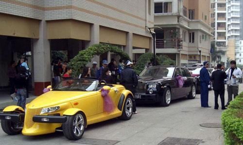 貌似并不高檔的小區(qū)內(nèi),卻出現(xiàn)了超豪華的強悍車隊:“獵獸”開頭,后面跟著三輛“幻影”,以及“賓利”“世爵”等車(如圖)。昨日,一則《福州某集團(tuán)老總嫁女,豪車云集》的帖子在某網(wǎng)站論壇走紅,該帖描述在福州的碧水芳洲小區(qū),某集團(tuán)老總嫁女,眾多豪車云集,場面壯觀。眾多網(wǎng)友稱,已被這些豪車震得說不出話來了。(成都晚報)