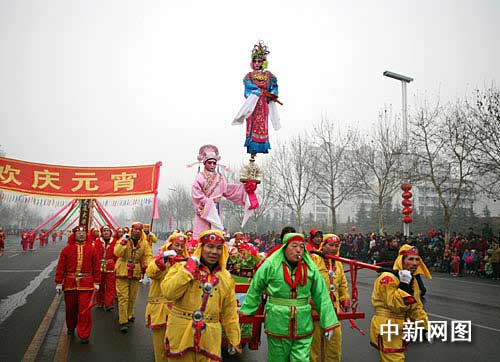 中新網周村2月9日電(記者 鞠成利 楊東亮 通訊員 王帝)今天上午,百年商埠山東省淄博市周村區元宵節民間藝術展演的現場熙熙攘攘,熱鬧非凡。踩高蹺、威風鑼鼓、舞龍燈,以及地方特色周村芯子……來自周村區4個街道辦事處20多個社區的民間藝術表演隊伍紛紛拿出自己的看家本事,為全區百姓帶來一場聲勢浩大、喜氣洋洋的元宵節民俗盛宴。