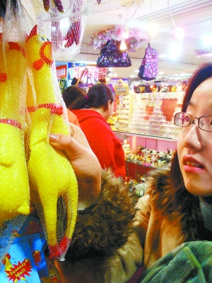 昨天下午,記者在崇文門搜秀玩具飾品區看到,至少有三四個攤位的老板都把這種慘叫雞玩具掛在了顯眼處。很多年輕人走過攤位時,都會被發泄雞鮮艷的顏色、奇特的造型所吸引。不由自主地捏上一把,傳來各種各樣的慘叫聲讓人忍俊不禁。