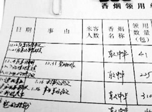 在一份招待用煙流水賬中,從2008年11月至2009年2月期間,招待用煙共用去了5277包,近530條。每個(gè)月的招待用煙數(shù)量都超過(guò)了1319包,均為中華香煙,有硬盒有軟包,按均價(jià)每盒50元算,相當(dāng)于每月要花銷(xiāo)6.6萬(wàn)元。記者發(fā)現(xiàn),其中用煙數(shù)量最多的是今年的1月份,共用去2789包中華牌香煙,約為280條。在這份招待用煙的流水賬最下方,則標(biāo)出了這四個(gè)月當(dāng)中招待用煙數(shù)目出現(xiàn)了超支,多用了1934包。