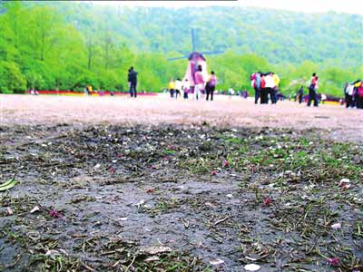 杭州市園林文物局花港管理處辦公室主任馮剛說,按太子灣的規模,人數超過1.1萬人次就要啟動應急預案,但清明節3天游客數量超過20萬人次,70%是外地游客。為防止意外,疏散人群,公園只能把觀賞草坪開放。后果是一半草坪被損,成片草坪被踩成黃泥地,游客為了拍照,踩踏、搖落的觀賞花不計其數。