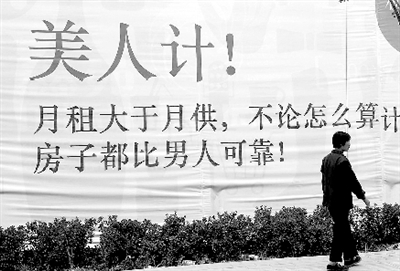 根據(jù)何先生所提供的線索,記者在河醫(yī)立交橋向西約1000米的棉紡東路上,看到了這則面朝南的巨幅房產(chǎn)廣告。白色布景的廣告墻上赫然寫著那句讓何先生不爽的廣告。該廣告美其名曰“美人計”,是為“粉領(lǐng)公寓”做的廣告,從廣告語來看,其目標(biāo)消費(fèi)群是女性。