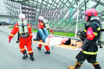 荷花園電信大樓高218米,共有地面建筑42層,是典型的超高層建筑。在昨日的演練中,最引人矚目的是高層供水加壓項目。“在高層建筑火災中,當消防戰士進入火場時,難免會遇到室內消火栓斷水的情況,這就要求我們必須有備用方案。”市消防支隊參謀長葛佳軍告訴記者,此次演練的主要內容之一就是高空加壓。此次假設的起火點位于39層,在消防車的轟鳴聲中,水帶迅速充足,一條白色的水龍沖天而起。“目前,我們的高空加壓垂直高度可達到280米左右。”葛佳軍說。(記者 千靈坡)
