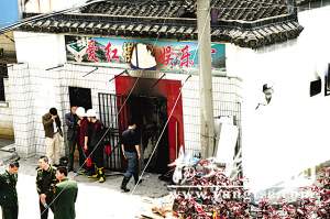 “愛紅棋牌室”西側(cè)緊挨古運(yùn)河,在一條名為“缺口河?xùn)|小街”的巷子的最里面。記者在現(xiàn)場(chǎng)看到,“愛紅棋牌室”東、南、北3面道路周圍都被警方用2至3道警戒線封鎖,大量警力在現(xiàn)場(chǎng)維持秩序。由于圍觀群眾太多,躍進(jìn)橋上的警戒線出現(xiàn)了多次被人潮擠斷的情況,民警及時(shí)進(jìn)行修復(fù)和更換。