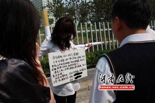 圖中女子身著修身白襯衣和黑色長褲,大幅框架眼鏡以及垂下的頭發遮住了臉,讓人看不清容貌。身上所背的十字架高出其頭頂,上面還有個過濾嘴,狀如香煙。據其胸前牌子上的文字描述,該女子是一“失業白領”,原老板喜歡在會議室吸煙,自己因受不了二手煙的危害,發了幾句牢騷,結果被老板辭退,所以采用行為藝術方式來求職。
