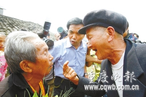 “劉東娃(劉召回的小名),讓我摸摸你頭頂的傷疤,好沒有?”只見一位年齡相仿的老人擠進人群,將雙手罩向了劉的后腦,撥開層層白發,撫摸著一道一寸來長的疤痕驚喜地說,“沒錯,就是東娃!你頭上這道傷疤,是我們一起下河摸魚時摔傷的,你還記得不?”