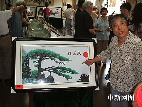 中新網鎮江七月一日電 (李君 王致同) 這是一幅長一米、寬六十厘米的《迎客松》圖,遠看似乎是照片或油畫,近看確是十字繡品,圖上繡成的翠柏勁松,傲然挺立,引人入勝。令人們難以置信的是,繡品作者竟然是鎮江市八十高齡老翁徐菊生。昨天,作為老人獻給共和國六十華誕的這幅十字繡品《迎客松》,在鎮江市老年活動室“露臉”,令人驚嘆不已。
