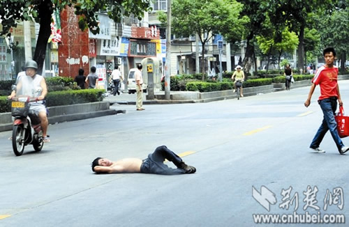 事發昨日正午,記者在漢陽郭茨口看到,一名男子上身裸露,手提一袋醫院的病歷資料,情緒激動地躺在馬路中央,脊背被路面燙得通紅。此時路面車流不息,該男子處境十分危險。“快把他拉回來!”幾名路人見狀后,靠近該男子,欲將其拉到路邊,但該男子并不領情,堅決不起身。幾分鐘后,二橋派出所的民警趕來,要求該男子去派出所再說,該男子置之不理。民警表示,早8時許和10時許,該男子曾在附近路面躺過兩次,都被他們帶回了派出所,他們這已是第三次為該男子出警!坝惺裁次驼f出來,那樣心里痛快點!币娒窬譄o策,熱心路人們開始輪番上前勸解。眾路人汗流浹背,頂著烈日站在馬路中央,對該男子動之以情、曉之以理。半小時后,該男子陸續說出了心中的不快。又經勸解,該男子終于答應跟民警回派出所,將事情說清楚。