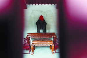 祠堂中擺放的李德海母親的銅像,上面蒙了一塊紅布。  本報記者 王申 攝