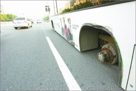 昨天下午6時,記者在大學路與長江路交叉口北約300米路西看到,車牌號為豫A90518的53路空調公交車車頭朝南,停在快車道上。其左后位置傾斜,車體觸及地面,車后的路面被劃出兩道約20米長的傷痕。兩個脫落的車輪放在公交車右側的花壇旁。在公交車內,一男一女兩人正在談論處理事宜。