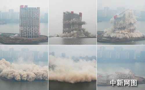 在現場,記者看到爆破后遺留的廢墟高約7至8米,據負責爆破的官員介紹,爆破產生的建筑垃圾面積達1萬平方米,重約4萬噸,將盡快被送往南昌市郊的垃圾填埋場。(完)