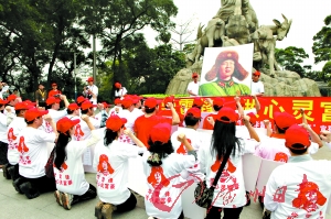 宣誓完畢,活動進入高潮,“老板們”后退一步,轉過身來面對著雷鋒畫像,齊齊雙膝跪地,以表示“對雷鋒精神的虔誠和最高敬意”,然后起立對畫像三鞠躬。隨后,這些人又向路人散發活動的紅色文化帽和文化衫,以號召更多人“向雷鋒同志學習”,把雷鋒精神轉化為自己的“心靈財富”。