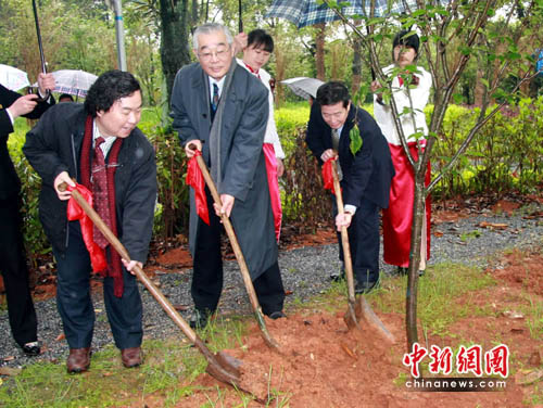 中新網長沙4月14日電(鄧霞 劉柱)冒著瀟瀟春雨,10來名日本友人今天專程來到湖南涉外人員培訓中心中日友好櫻花園,為這里新植的700株櫻花樹苗添土。據介紹,該櫻花園由日本育櫻會捐資興建。
