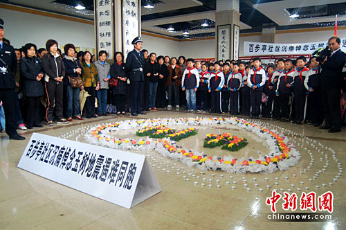 上午10時,數百名武漢百步亭居民、育才小學學生代表有序來到社區活動中心。在工作人員的引導下,他們靜靜地圍繞著用鮮花扎成的“4.14之心”分排站好,手捧蠟燭,向遇難同胞默哀。活動現場,居民自發手折紙鶴,以此寄托對災區民眾的牽掛與祝愿。