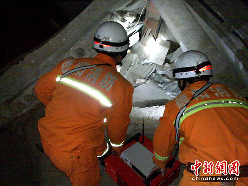 4月15日,玉樹縣結古鎮氣象賓館旁的民房,肖國平和白云飛的視頻生命探測儀發揮了作用。據群眾反應,這里有被埋人員,肖國平與白云飛立即就沖了上去。這幢民房整體坍塌,他們在廢墟里仔細探尋,殘垣斷壁露出的鐵釘、鋼筋、瓦礫讓他們行動困難,臉劃破了全然不顧。然而一分一秒過去了,儀器上遲遲沒有發現生命跡象,但他們沒有放棄,繼續將視頻探頭深入廢墟中,最終在一個倒塌的墻體下發現疑似人體的跡象。