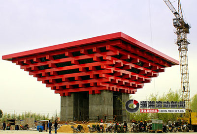 帖子描述說,這座紅色的建筑高24米,四方形的平臺邊長50米。上部是四方冠形結構,外頂部邊長43米,其6層架空層全部為鋼架結構;下面還有四個鋼筋混凝土大立柱。整個建筑在結構、色調和外形等方面都和世博會中國館相似。